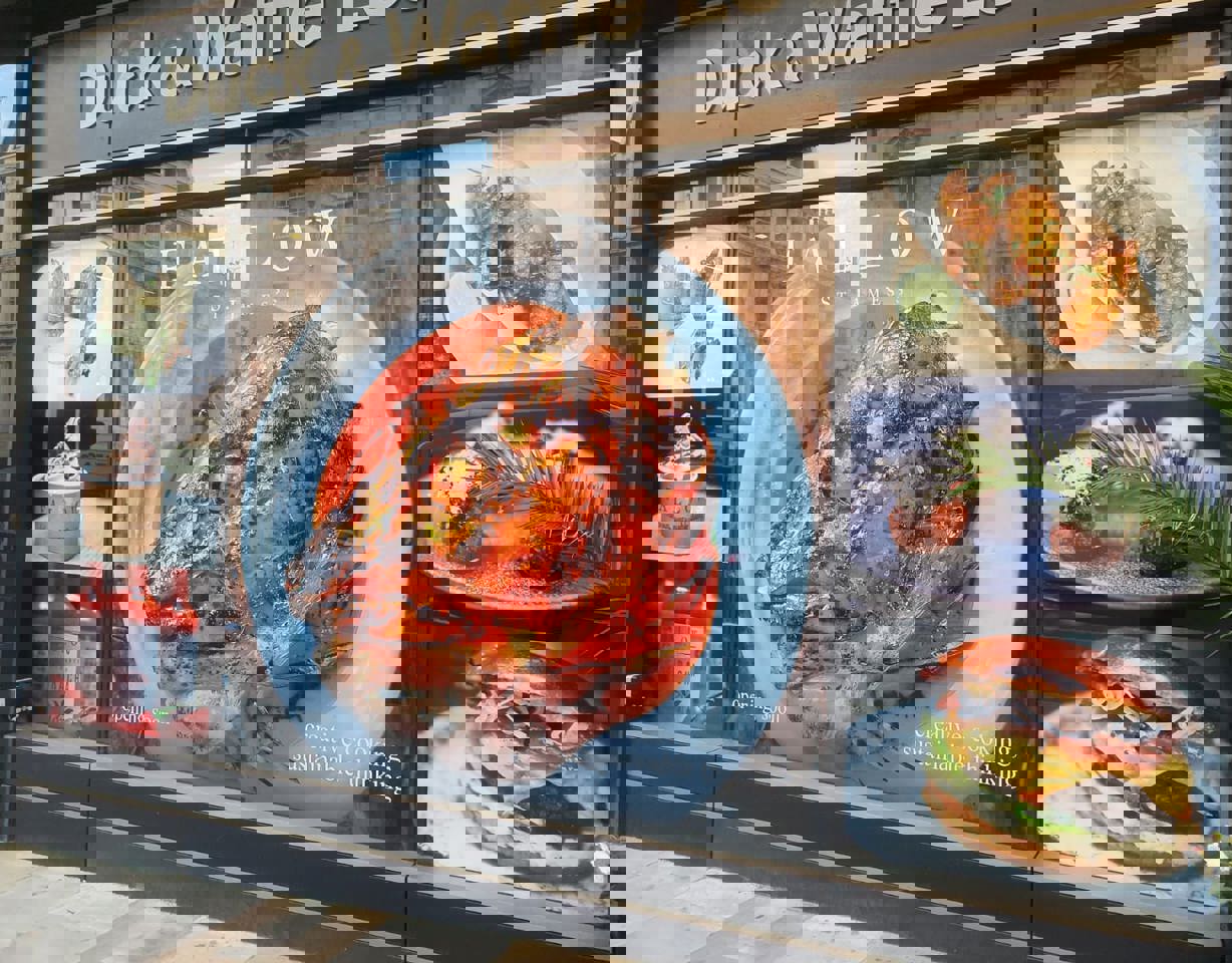 Colourful multi panel windows and eye-catching entrance door imagery carry the ethos of the restaurant brand message - Creative Cooking; Sustainable Thinking - whilst providing menu, contact and recruitment information as text and QR codes.