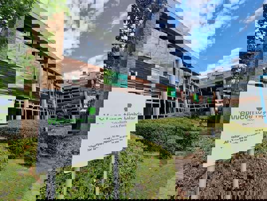 Signs Express offered a range of solutions superimposing the options onto site survey photos enabling the client to have a clear idea of the suggested solutions. Ultimately, the choice for the main school entrance sign was built up powder coated external lettering in the school's brand colour along the full width of the cladded entrance. Our installation teams worked from varying access equipment to accommodate the height and multiple obstacles.