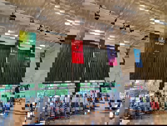 To highlight the school house groups, we installed suspended banners from the existing lighting rig within the main hall. We needed to ascertain the weight restrictions this would involve to ensure the appropriate banners and fixings would be used.