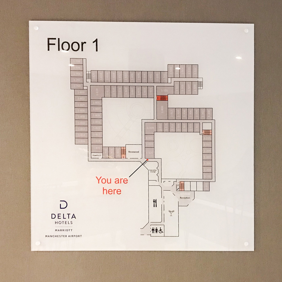 The signs we provided included ‘you are here’ and floor plan signs placed at strategic points to improve the experience of arriving and exploring guests. As a busy hotel linked directly to Manchester airport, the new wayfinding signs had an immediate impact as soon as they were fitted – guests began using them straight away without any prompting, which quickly tested and affirmed the positions we chose as effective!