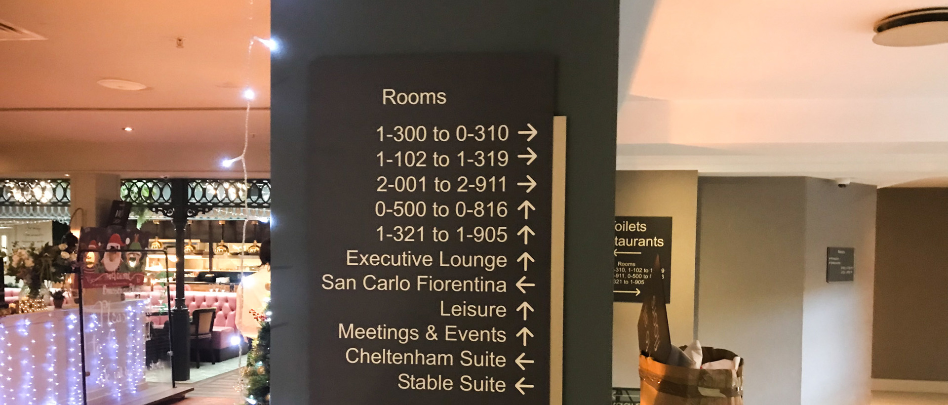 Due to the large amount of wayfinding signs already in place in the hotel, it was a challenge to create new ones that exactly matched their colour, texture, finish, and font. However, thanks to the knowledge and experience of the Macclesfield team, the end-result blends perfectly with the pre-existing signage.