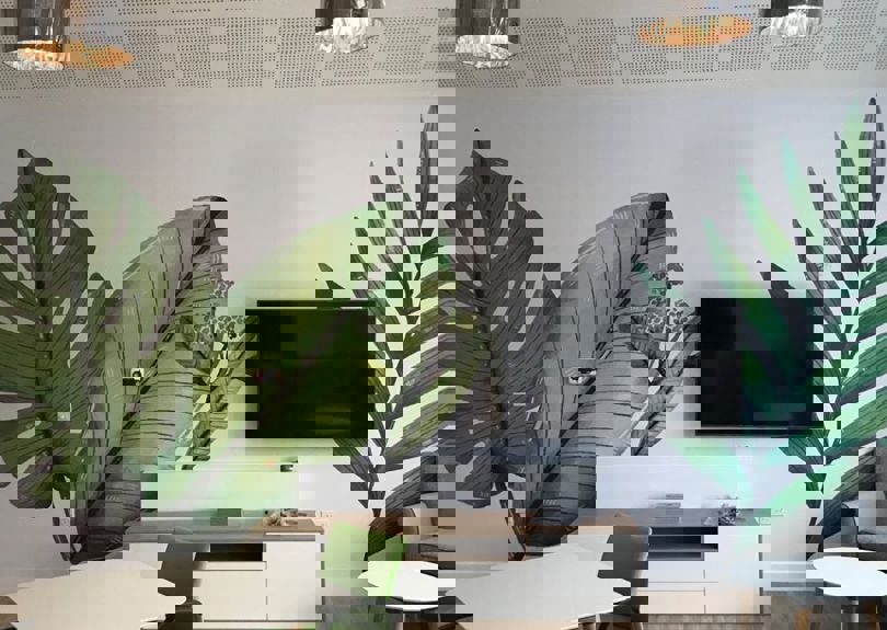 Make the most of blank walls to display logos and branding to create an engaging and inspiring space.